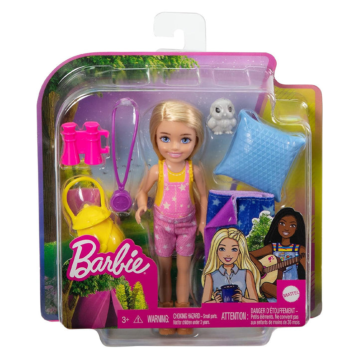 Head outdoors and enjoy camping fun with Chelsea doll, inspired by on-screen adventures from the hit series Barbie It Takes Two! This playset has everything kids need for day-to-night campout play with Chelsea doll and her adorable baby owl friend. Play out a day of exploring with Chelsea doll and her pet, a pair of binoculars and a compass she can wear around her neck. After a day of adventure, tuck Chelsea doll into her star-print sleeping bag and keep cozy with a pillow and flashlight. This Barbie It Takes Two Chelsea doll and playset inspires kids ages 3 to 7 to dream of endless outdoor adventures. The doll cannot be alone. Colors and decorations may vary.