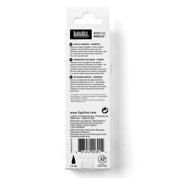 Made with highly lightfast artist-quality pigments, Acrylic Marker gives you the ultimate control, and is water-resistant when dry. Discover three bold colors with this fine-nib Favorites set.