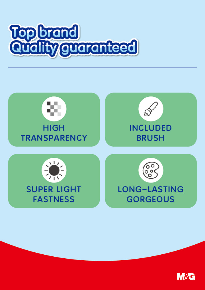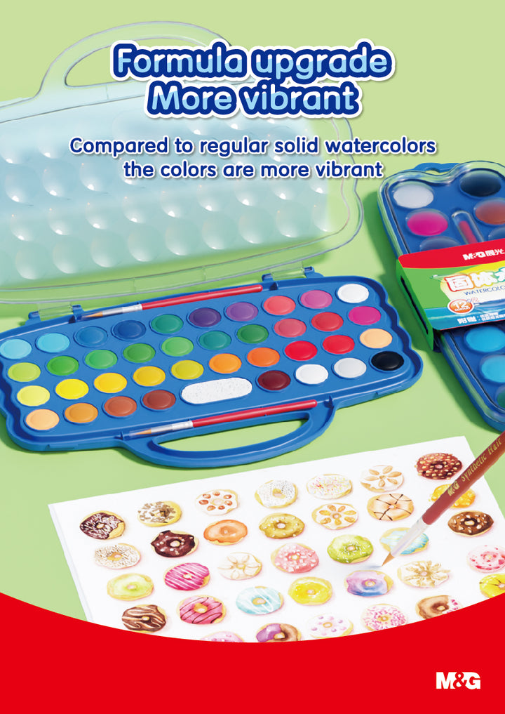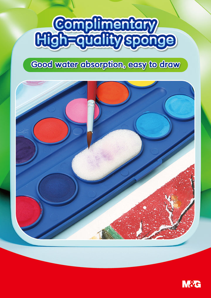 The M&G Watercolor Blocks Set is the ultimate all-in-one solution for artists of all skill levels. Available in sets of 12, 24, and 36 colors, each set also includes 2 extra free colors, ensuring even more options for creative expression. Featuring delicate pigments with good water solubility, this set offers excellent blending and diffusivity for soft, transparent color effects after drying. The upgraded formula ensures vibrant, long-lasting colors, and the set comes with all the essential tools—a premium nylon brush, detachable palette, and a high-quality sponge for water absorption. The compact flip design adds convenience, making it easy to carry anywhere. Ideal for school projects, hobbies, or professional artwork, this set guarantees a premium watercolor experience.