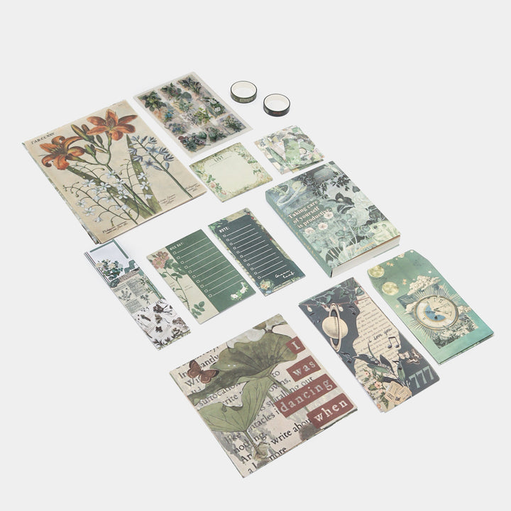 The set contains many vintage stickers and pictures.