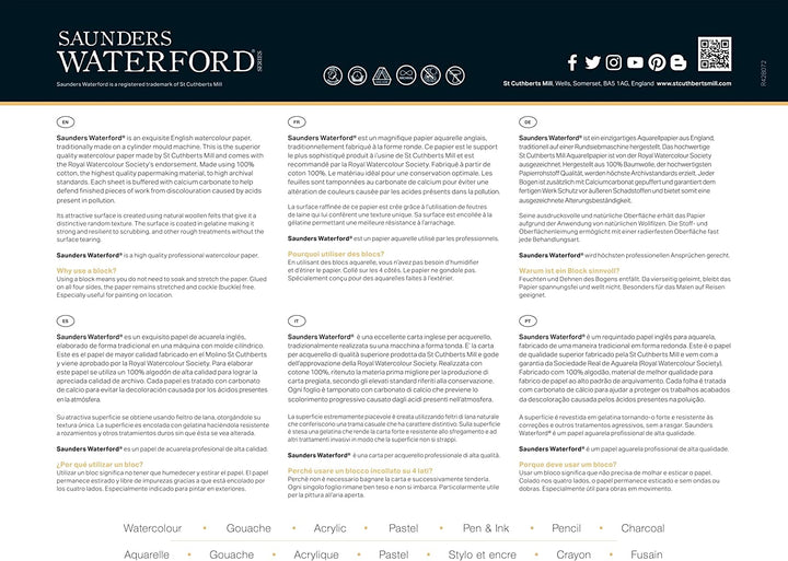 Each sheet buffer with calcium carbonate to help defend finished pieces of work from discolouration caused by acids present in atmospheric pollution. Its attractive surface is created using natural woollen felts that give it a distinctive random texture. The surface is sized in gelatine making it strong and resilient to scrubbing, and other rough treatment Saunders Waterford is a top quality professional watercolour paper.