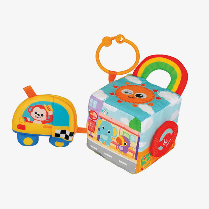 - Lenticular smiling sun face, squeaky and crinkle taxi, baby-safe mirror, colorful rainbow handle and steering wheel